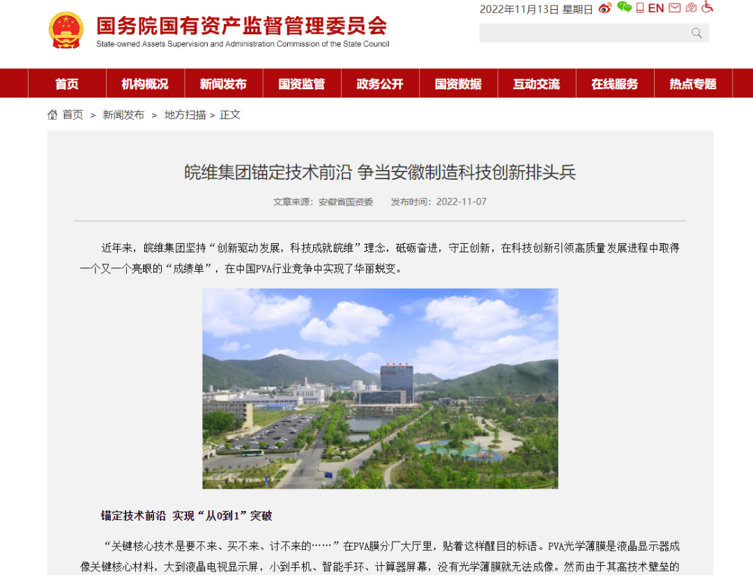 繼省國資委公眾號頭條專題報道公司科技創(chuàng)新工作后,日前,國務(wù)院國資委網(wǎng)站地方掃描欄目以《皖維集團(tuán)錨定技術(shù)前沿 爭當(dāng)安徽制造科技創(chuàng)新排頭兵》為題作了深入報道。